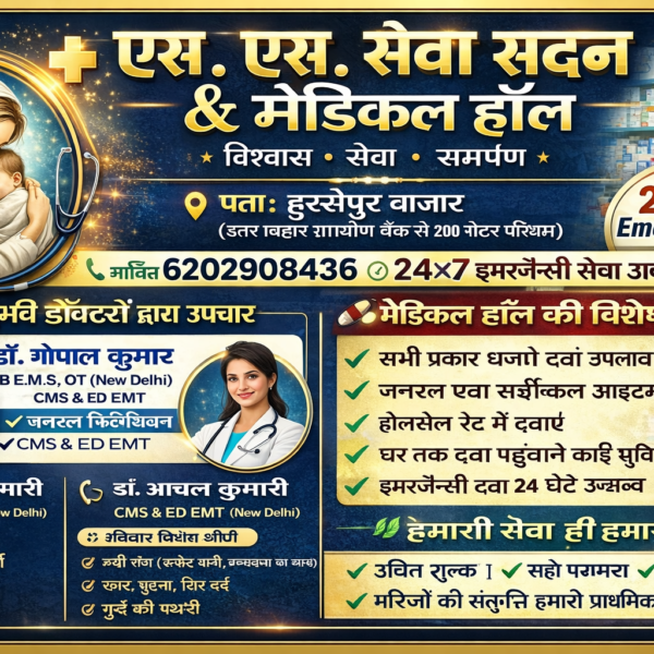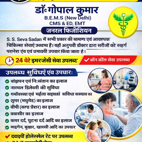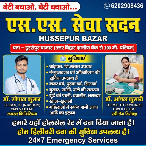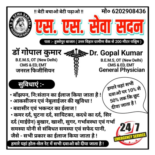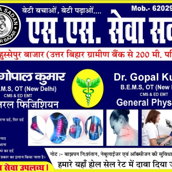 S.S. Seva Sadan тАУ General Physician Clinic ЁЯУН рд╣реБрд╕реНрд╕реЗрдкреБрд░ рдмрд╛рдЬрд╛рд░ (рдЙрддреНрддрд░ рдмрд┐рд╣рд╛рд░ рдЧреНрд░рд╛рдореАрдг рдмреИрдВрдХ рд╕реЗ 200 рдореАрдЯрд░ рдкрд╢реНрдЪрд┐рдо) ЁЯУЮ Mob: 6202908436 Dr. Gopal Kumar B.E.M.S (New Delhi) CMS…
