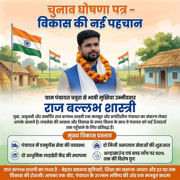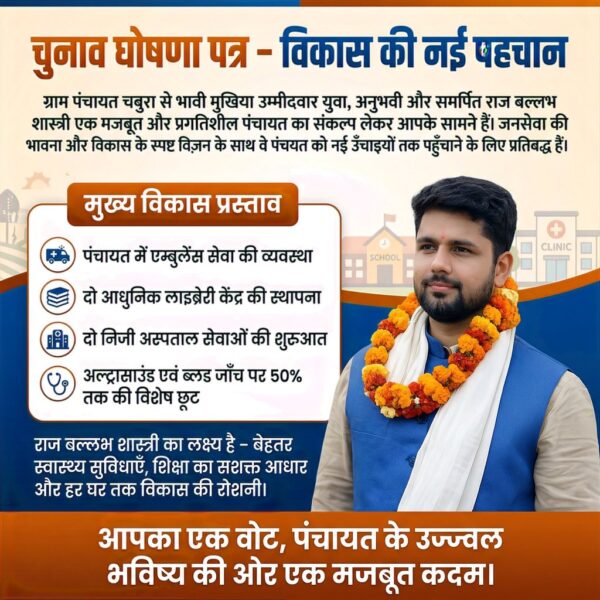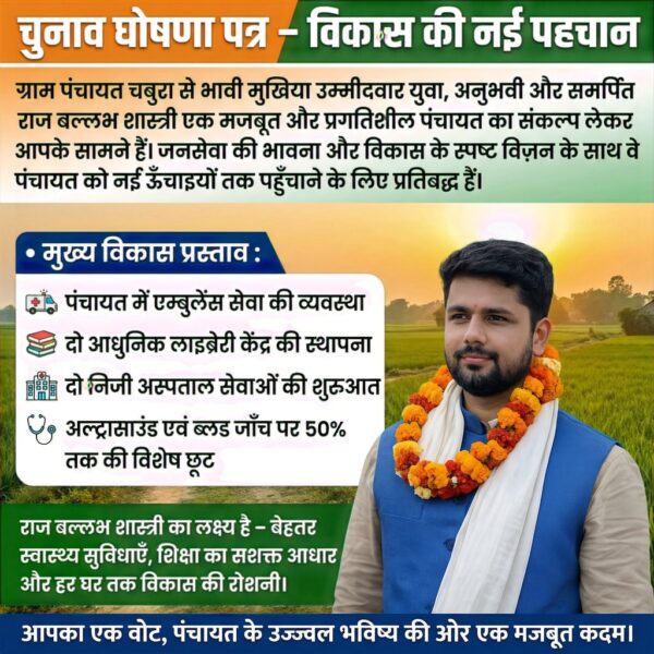 рдЪреБрдирд╛рд╡ рдШреЛрд╖рдгрд╛ рдкрддреНрд░ тАУ рд╡рд┐рдХрд╛рд╕ рдХреА рдирдИ рдкрд╣рдЪрд╛рди рдЧреНрд░рд╛рдо рдкрдВрдЪрд╛рдпрдд рдЪрдмреБрд░рд╛ рд╕реЗ рднрд╛рд╡реА рдореБрдЦрд┐рдпрд╛ рдЙрдореНрдореАрджрд╡рд╛рд░ рдпреБрд╡рд╛, рдЕрдиреБрднрд╡реА рдФрд░ рд╕рдорд░реНрдкрд┐рдд рд░рд╛рдЬрдмрд▓реНрд▓рдн рд╢рд╛рд╕реНрддреНрд░реА рдПрдХ рдордЬрдмреВрдд рдФрд░ рдкреНрд░рдЧрддрд┐рд╢реАрд▓ рдкрдВрдЪрд╛рдпрдд рдХрд╛ рд╕рдВрдХрд▓реНрдк…