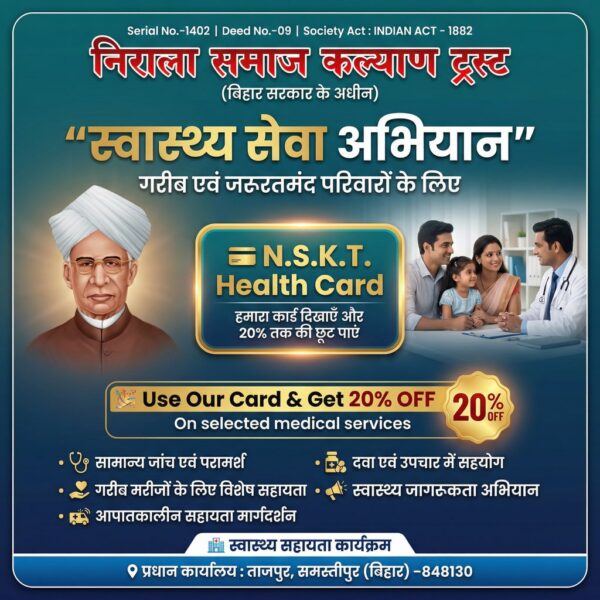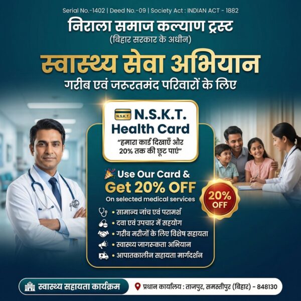 рдЯреНрд░рд╕реНрдЯ рджреНрд╡рд╛рд░рд╛ рд╕рдВрдЪрд╛рд▓рд┐рдд тАЬрд╕реНрд╡рд╛рд╕реНрдереНрдп рд╕реЗрд╡рд╛ рдЕрднрд┐рдпрд╛рдитАЭ рдХреЗ рдЕрдВрддрд░реНрдЧрдд N.S.K.T. Health Card рдЬрд╛рд░реА рдХрд┐рдпрд╛ рдЧрдпрд╛ рд╣реИ, рдЬрд┐рд╕рдХреЗ рдорд╛рдзреНрдпрдо рд╕реЗ рд▓рд╛рднрд╛рд░реНрдерд┐рдпреЛрдВ рдХреЛ рдЪрдпрдирд┐рдд рдЪрд┐рдХрд┐рддреНрд╕рд╛ рд╕реЗрд╡рд╛рдУрдВ рдкрд░ 20% рддрдХ рдХреА рд╡рд┐рд╢реЗрд╖ рдЫреВрдЯ рдкреНрд░рджрд╛рди рдХреА рдЬрд╛рддреА рд╣реИред