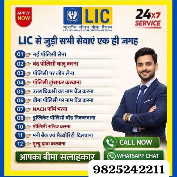 ग्राहक-प्रथम दृष्टिकोण के साथ, विशालदीप अपने ग्राहकों को उनकी वित्तीय लक्ष्यों, जीवन के चरण और दीर्घकालिक सुरक्षा की आवश्यकताओं के अनुसार सही LIC पॉलिसी चुनने में व्यक्तिगत मार्गदर्शन प्रदान करते हैं। उनकी सेवाओं में जीवन बीमा योजना, बच्चों की शिक्षा योजनाएँ, रिटायरमेंट प्लानिंग, बचत और निवेश योजनाएँ, तथा पॉलिसी सर्विसिंग सहायता शामिल हैं।
